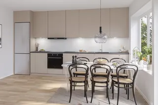The apartment is 62.7 sqm with light-colored walls and white-glazed oak flooring. Total renovation in 2021. The kitchen includes a stainless steel refrigerator, freezer, dishwasher, built-in microwave, and range hood, along with dark gray composite stone countertops and a glass-ceramic stovetop. The fully tiled bathroom features glass shower walls, floor heating, a washing machine, and a dryer. Glazed balcony with sliding windows included. Storage unit and communal laundry room available. TV provider: Tele2, included in the rent. Located on the 3rd floor. The property is situated in the Yggdrasil area, featuring open grassy areas and playgrounds, as well as nice walking and cycling paths to the city center and nature.